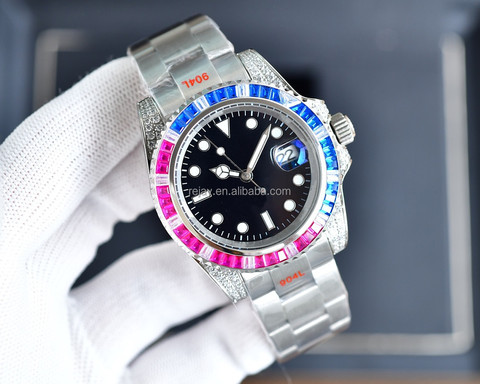 Reloj mecánico automático para hombre, correa de goma, tamaño 40mm, bisel de diamante arcoíris, calendario, movimiento de pantalla, reloj luminoso